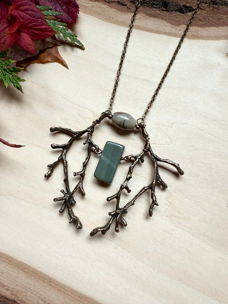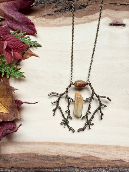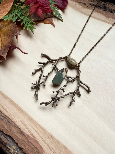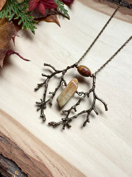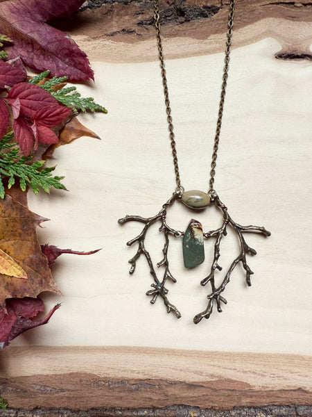 Meet your new favorite conversation starter! This whimsical necklace features an organic Red Creek Jasper stone nestled snugly between two charming branches, like nature decided to give you a hug. With an extra jasper stone for added pizzazz, the Harvest Cradle brings playful personality and earthy charm to your jewelry collection. It's the kind of piece that makes people stop and ask, "Where did you find that?"