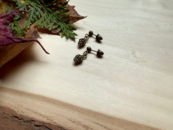 Tiny woodland treasures meet everyday sparkle with these charming pinecone studs. Crafted from oxidized brass, each stud captures nature's geometric beauty in miniature form, perfect for adding a whimsical touch to your look.