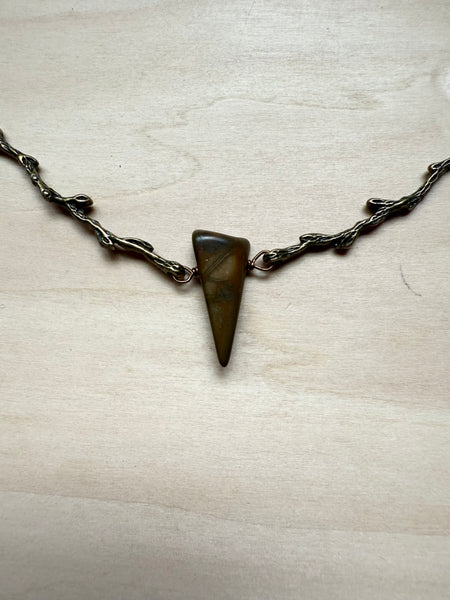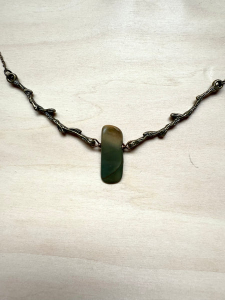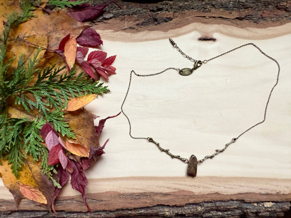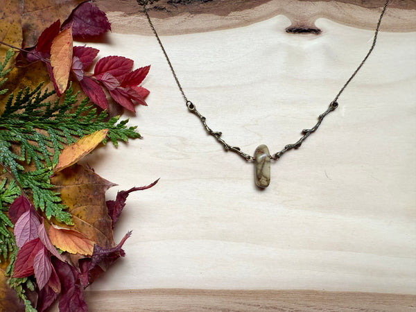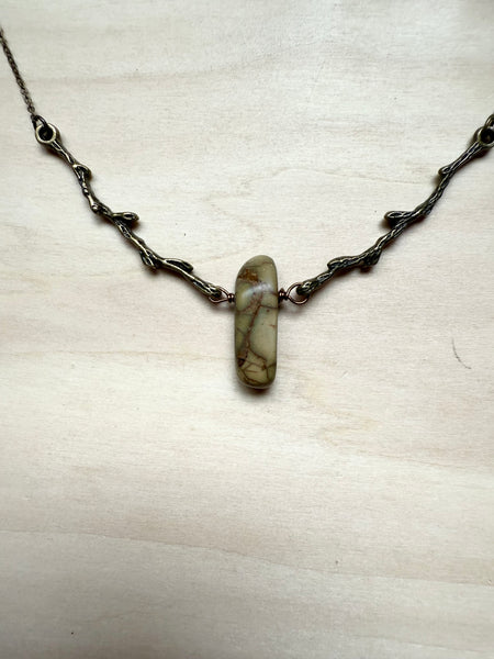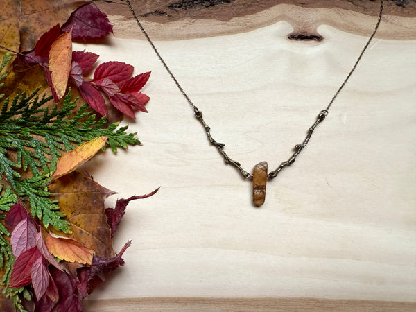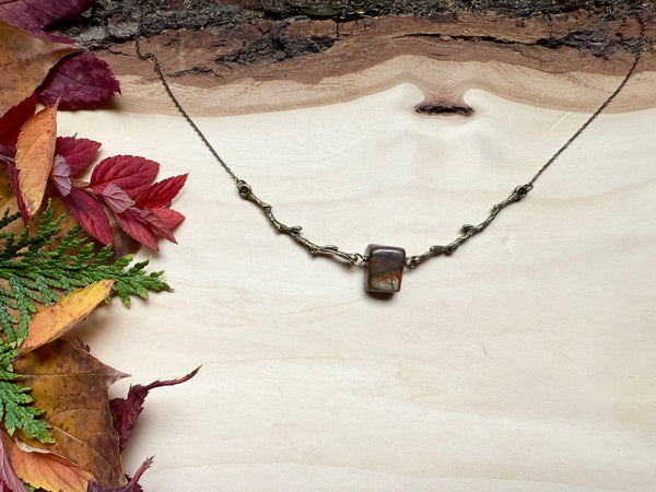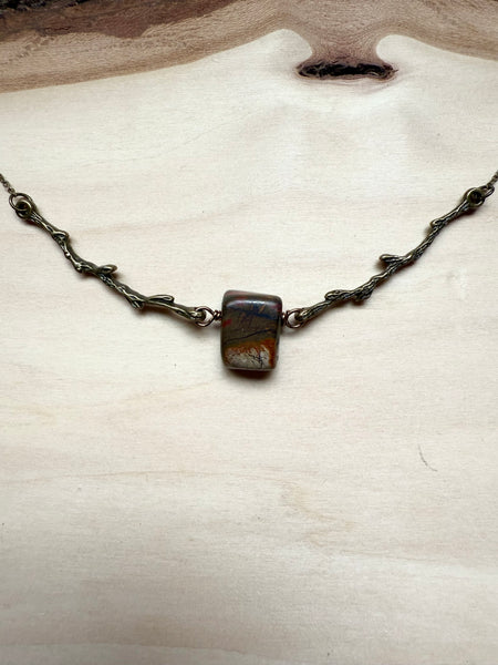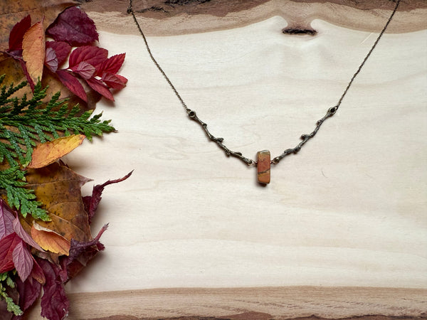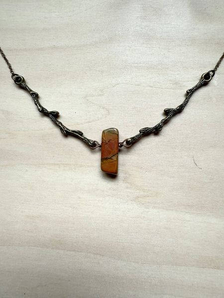 Nestled between two branches, this striking Red Creek jasper stone creates a one-of-a-kind pendant that's equal parts earthy and enchanting. The rich, warm tones of the jasper pair beautifully, making it a conversation starter that celebrates nature's artistry. Perfect for anyone who loves wearing a little geological magic around their neck.